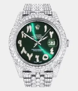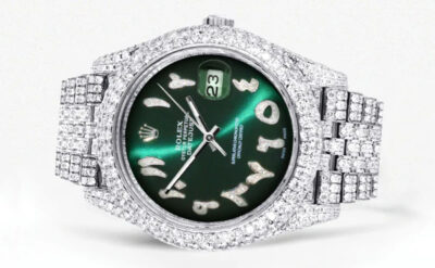 500,00 $ – 1.600,00 $Diamond Iced Out Rolex Datejust 41 | 25 Carats Of Diamonds | Custom Green Arabic Numeral Diamond Dial | Two Row | Jubilee Band Replik