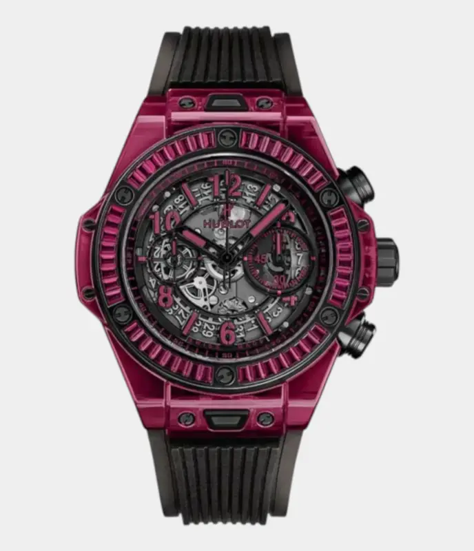 500,00 $ – 1.600,00 $Hublot Big Bang 411.JR.4901.RT.1902 45mm Red Sapphire Baguette Bezel Skeleton Dial Chronograph Replik