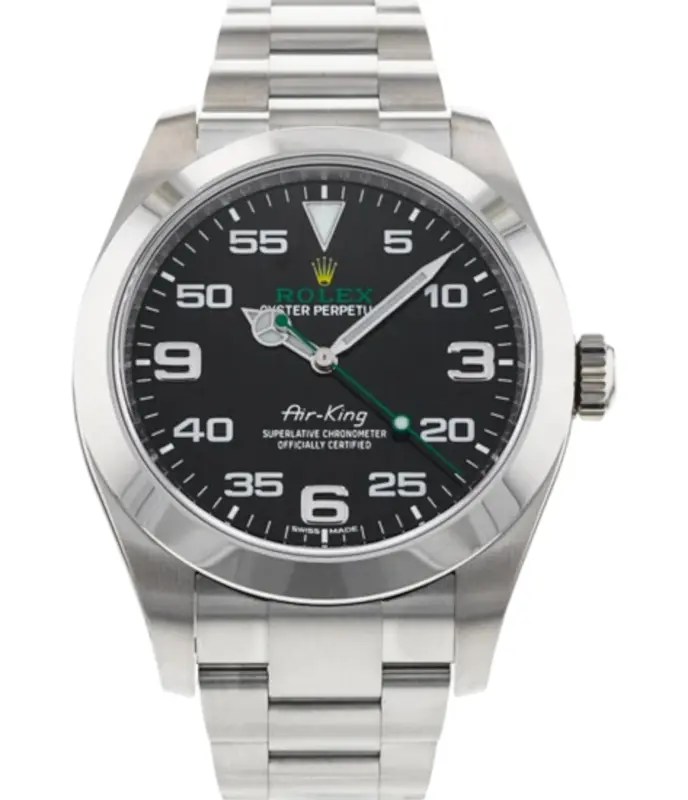 Die Rolex Air-King 116900 Oyster Perpetual mit schwarzem Zifferblatt, grünem Sekundenzeiger, weißen arabischen Ziffern und poliertem Edelstahlgehäuse kombiniert klassische Eleganz mit herausragender Funktionalität. Mit einem präzisen Automatikwerk und markantem Design ist sie die perfekte Uhr für Uhrenliebhaber und Abenteurer.