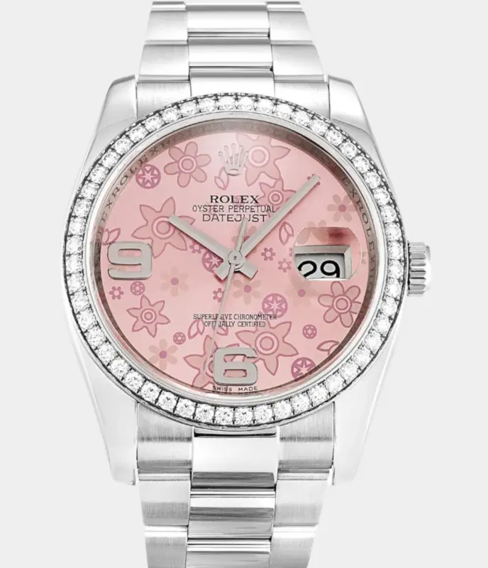 Die Rolex Datejust 116244 mit rosa Floral-Zifferblatt und diamantbesetzter Lünette verbindet verspielte Eleganz mit klassischem Rolex-Design. Eine luxuriöse Damenuhr mit Automatikwerk und zeitlosem Stil.