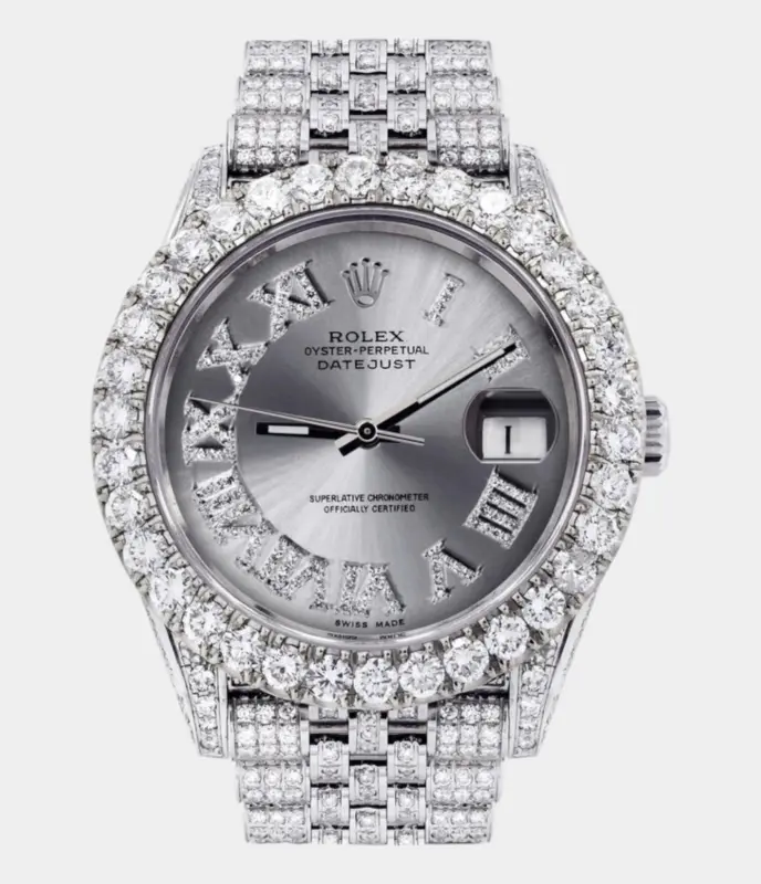 Diamond Iced Out Rolex Datejust 41 | 25 Carats Of Diamonds | Custom Silver Roman Diamond Dial | Jubilee Band Replik