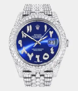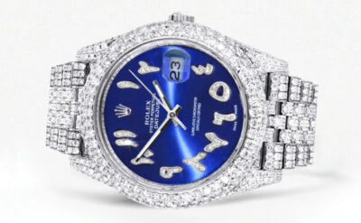 500,00 $ – 1.600,00 $Diamond Iced Out Rolex Datejust 41 | 25 Carats Of Diamonds | Custom Blue Arabic Numeral Diamond Dial | Two Row | Jubilee Band Replik