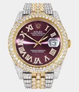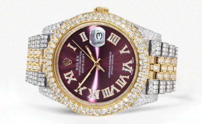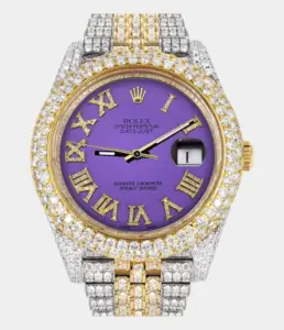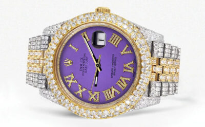 500,00 $ – 1.600,00 $Diamond Iced Out Rolex Datejust 41 | 25 Carats Of Diamonds | Custom Purple Roman Numeral Diamond Dial | Two Tone | Two Row | Jubilee Band Replik