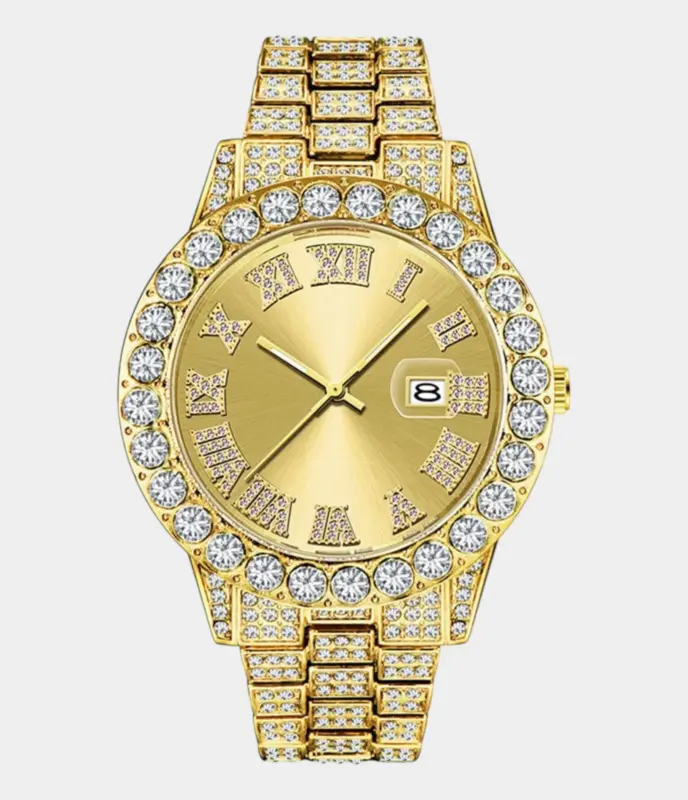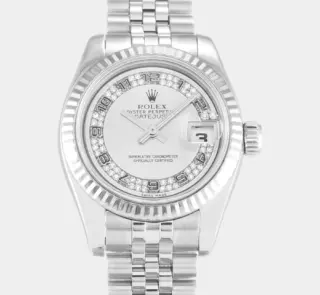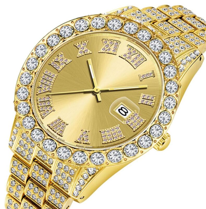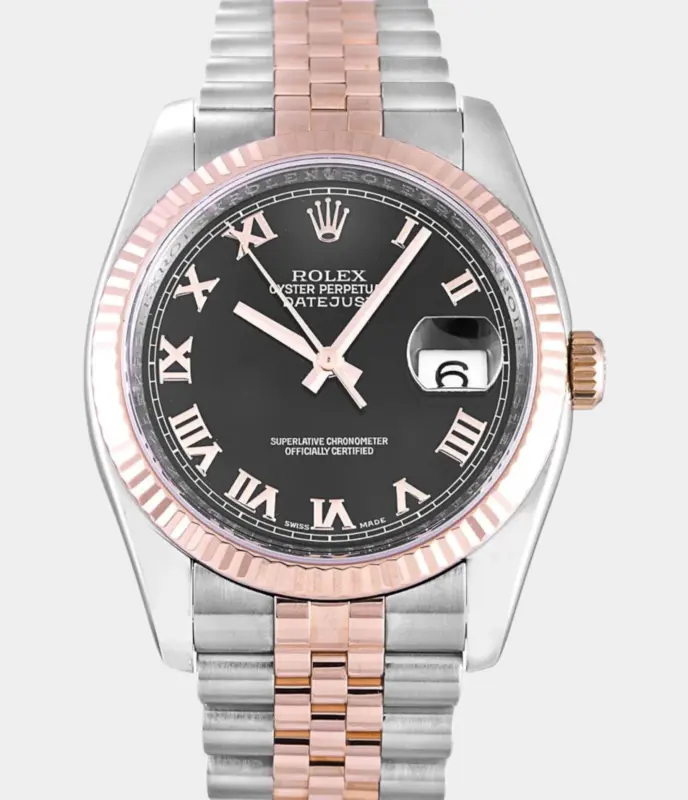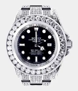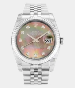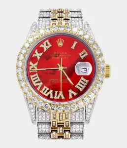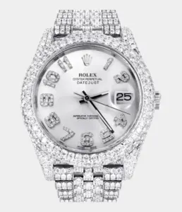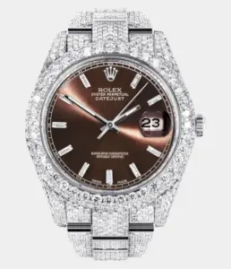 Diese Rolex Datejust 41 Replik mit 25 Karat Diamanten, Perlmutt-Zifferblatt und zweifarbiger Ausführung verkörpert puren Luxus. Das Oyster-Band und das vollbesetzte Gehäuse machen sie zu einem brillanten Statement für exklusive Anlässe.