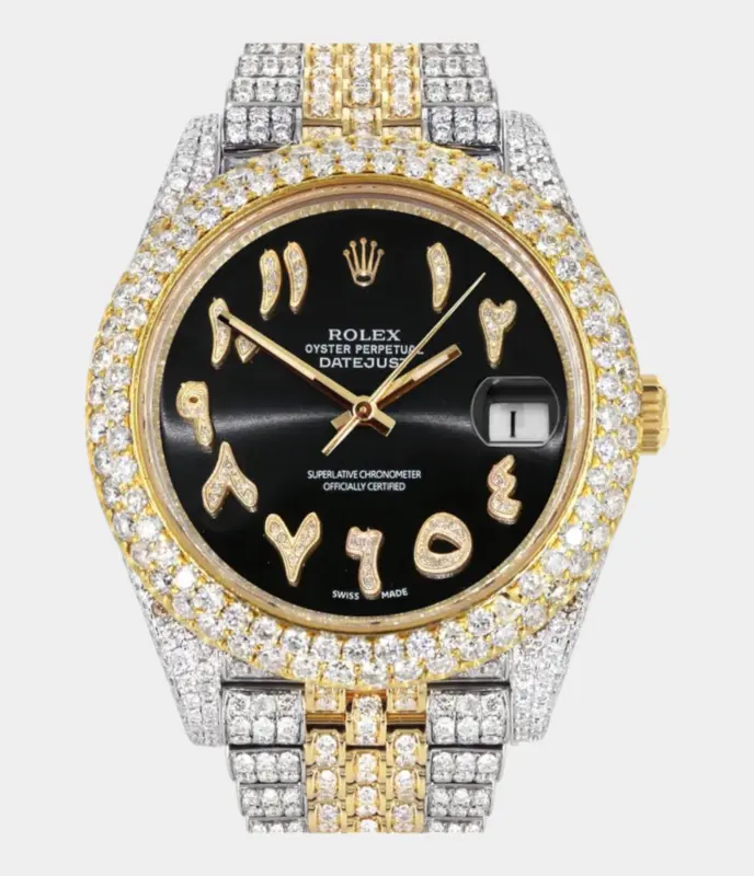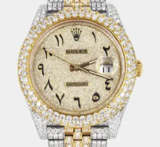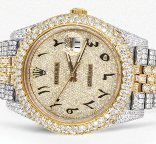 500,00 $ – 1.600,00 $Diamond Iced Out Rolex Datejust 41 | 25 Carats Of Diamonds | Custom Gold Arabic Numeral Diamond Dial | Two Tone | Two Row | Jubilee Band Replik