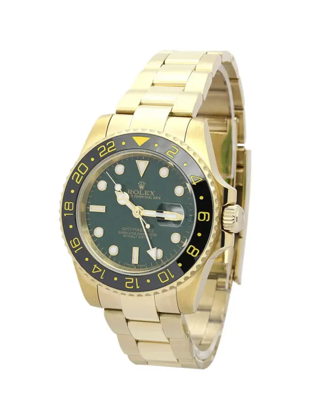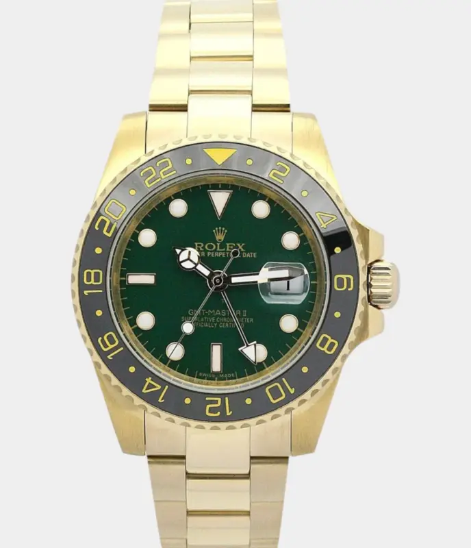 Die Rolex GMT-Master II 116718LN Replik mit grünem Jubiläumszifferblatt, schwarzer Keramiklünette und 18K Goldgehäuse ist eine luxuriöse, kraftvolle GMT-Uhr für Kenner und Sammler.