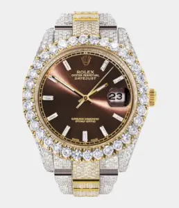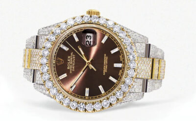 500,00 $ – 1.600,00 $Diamond Iced Out Rolex Datejust 41 | 25 Carats Of Diamonds | Morocco Brown Diamond Dial | Two Tone | Oyster Band Replik