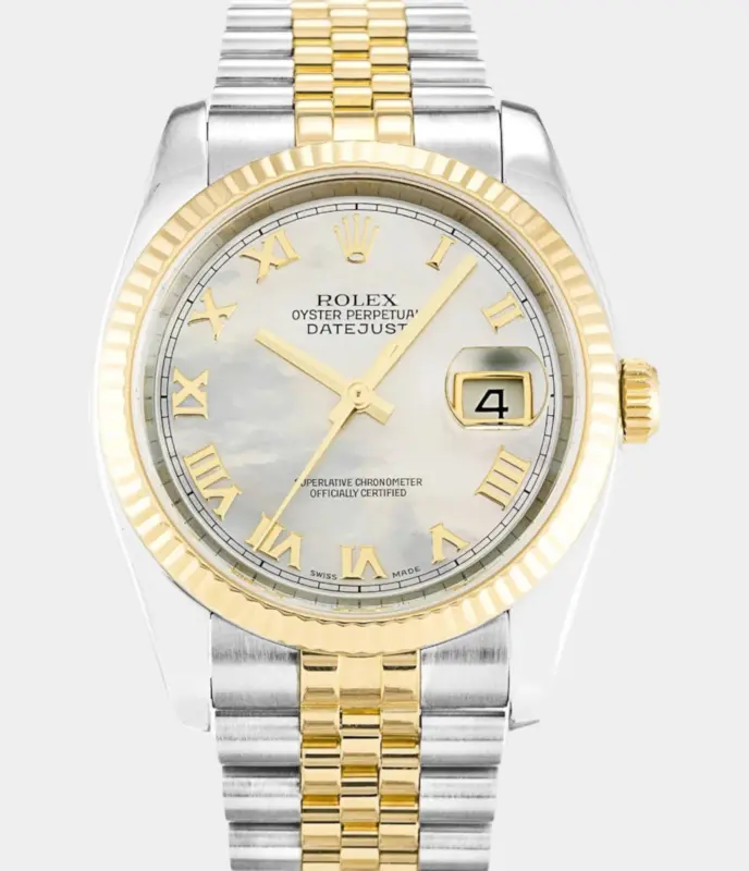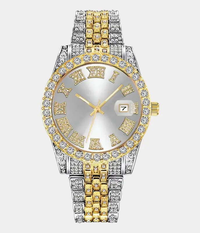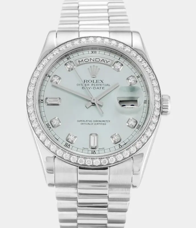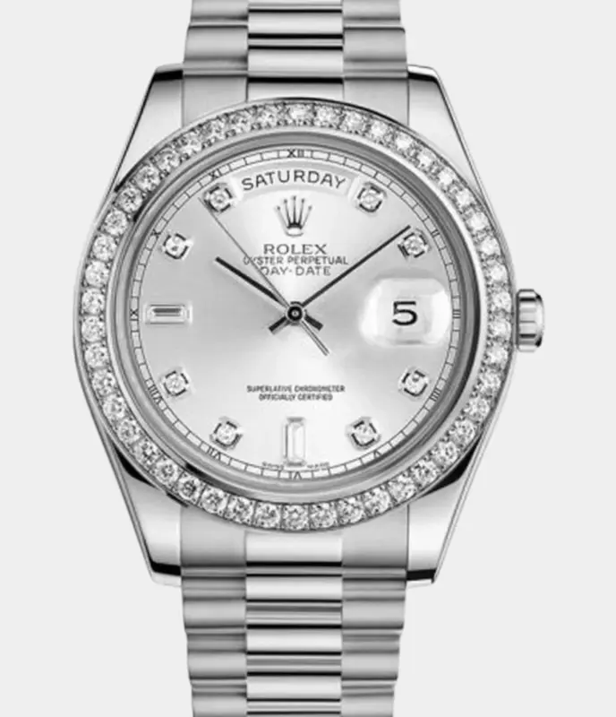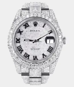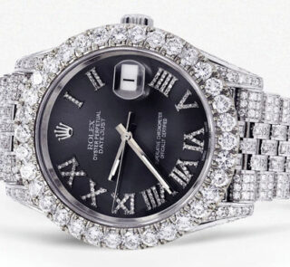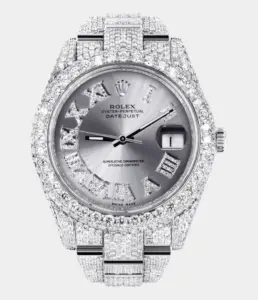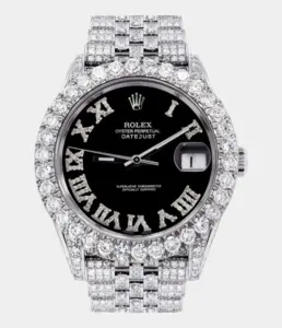 Diese Rolex Datejust 41 Replik ist vollständig mit 25 Karat Diamanten besetzt und verfügt über ein individuell gestaltetes Zifferblatt in Blau-Schwarz mit römischen Ziffern. Die zweifarbige Optik und das Jubilé-Band machen sie zum luxuriösen Highlight für besondere Anlässe.