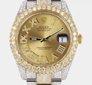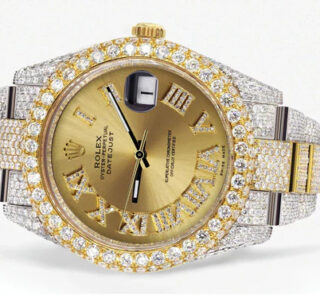 500,00 $ – 1.600,00 $Diamond Iced Out Rolex Datejust 41 | 25 Carats Of Diamonds | Custom Gold Roman Numeral Diamond Dial | Two Tone | Two Row | Oyster Band Replik