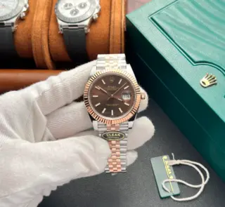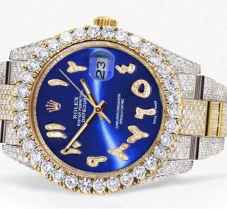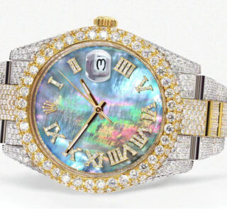 Diese luxuriöse Rolex Datejust 41 Replik ist vollständig mit 25 Karat Diamanten besetzt, kombiniert mit einem grünen Custom-Zifferblatt und zweifarbiger Jubilee-Band – ein strahlendes Statement aus Eleganz, Extravaganz und höchster Uhrmacherkunst.
