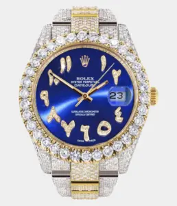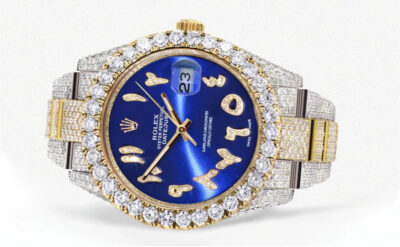 500,00 $ – 1.600,00 $Diamond Iced Out Rolex Datejust 41 | 25 Carats Of Diamonds | Custom Blue Arabic Numeral Diamond Dial | Two Row | Oyster Band Replik