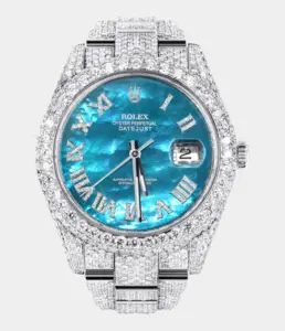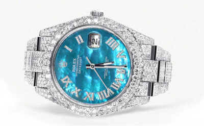 500,00 $ – 1.600,00 $Womens Diamond Iced Out Rolex Datejust 41 | 25 Carats Of Diamonds | Aquamarine Mother of Pearl Dial | Two Row | Oyster Band Replik