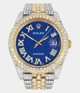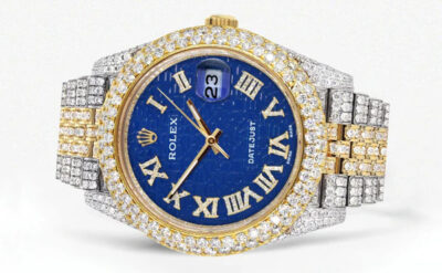 500,00 $ – 1.600,00 $Diamond Iced Out Rolex Datejust 41 | 25 Carats Of Diamonds | Blue Text Pattern Dial | Two Tone | Two Row | Jubilee Band Replik