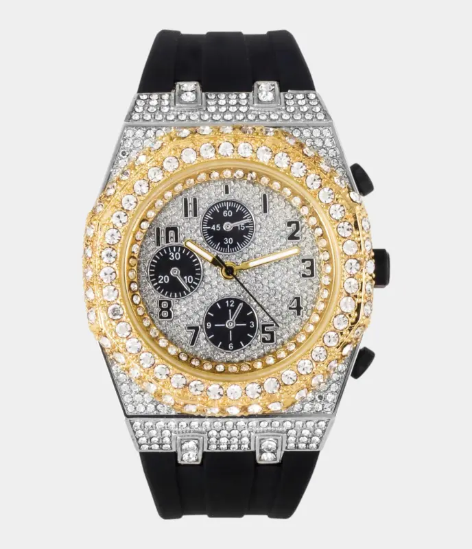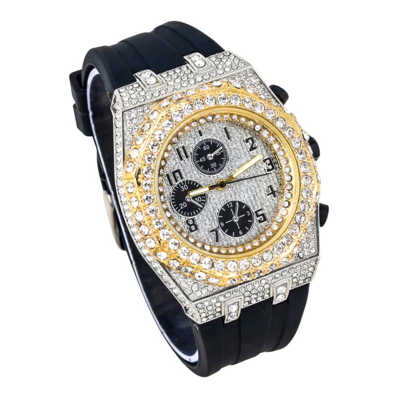 Men’s 43mm Iced Out Octagonal Case Silicone Band Watch Two Tone-silver Replik
