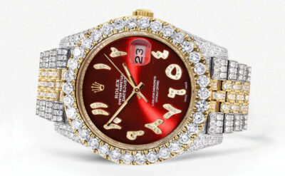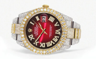 500,00 $ – 1.600,00 $Diamond Iced Out Rolex Datejust 41 | 25 Carats Of Diamonds | Custom Red Arabic Numeral Diamond Dial | Two Tone | Jubilee Band Replik