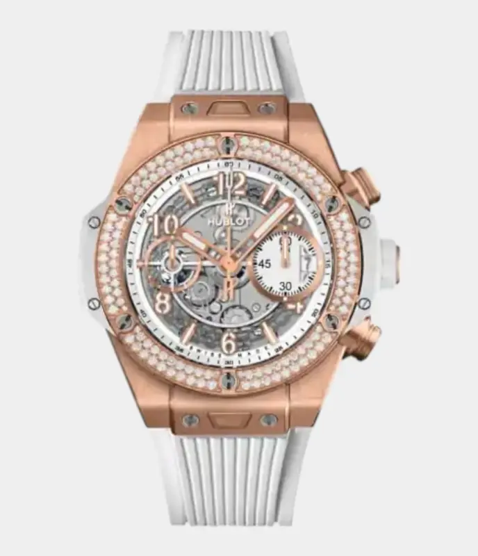 500,00 $ – 1.600,00 $Hublot Big Bang 411.JX.4802.RT.1904 45mm Rose Gold White Strap Diamond Bezel Skeleton Dial Replik