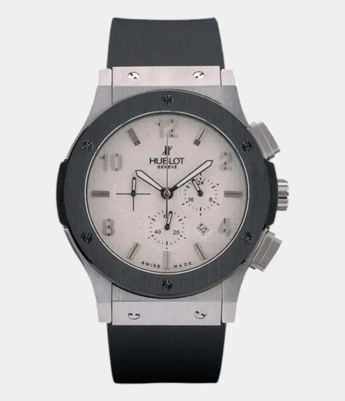 Die Hublot Big Bang 80196 mit weißem kariertem Zifferblatt, schwarzer Lünette und schwarzem Kautschukarmband bietet eine perfekte Kombination aus sportlichem Design und luxuriöser Funktionalität. Diese Uhr ist die ideale Wahl für Uhrenliebhaber, die ein modernes und zugleich robustes Design suchen.