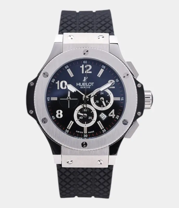 Die Hublot Big Bang Ure 4102 mit Edelstahlgehäuse, schwarzem Zifferblatt und strukturiertem schwarzem Kautschukarmband kombiniert sportliches Design mit hervorragender Funktionalität. Diese Uhr bietet eine elegante und robuste Optik, ideal für Uhrenliebhaber, die Präzision und Stil suchen.