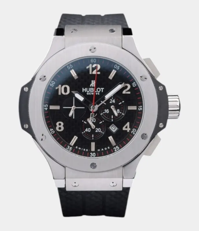 Die Hublot Big Bang Ure 4107 mit Edelstahlgehäuse, schwarzem kariertem Zifferblatt und schwarzem Kautschukarmband kombiniert sportliches Design mit hochwertiger Verarbeitung. Diese Uhr bietet eine perfekte Mischung aus Robustheit und Eleganz, ideal für Uhrenliebhaber, die nach Funktionalität und Stil suchen.