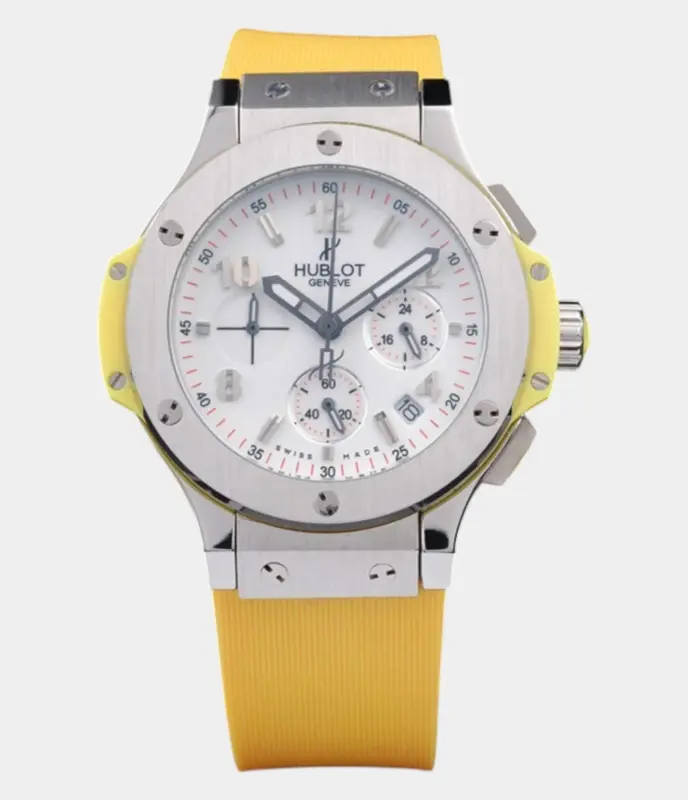 Die Hublot Big Bang Ure 4127 mit Edelstahlgehäuse, weißem Zifferblatt und gelbem Kautschukarmband kombiniert sportliches Design mit lebendigen Farben. Diese Uhr bietet eine auffällige Optik und außergewöhnliche Funktionalität, perfekt für Uhrenliebhaber, die sowohl Stil als auch Leistung schätzen.