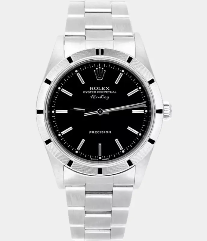 Die Rolex Air-King 14010 mit schwarzem Zifferblatt und Edelstahlgehäuse bietet klassische Eleganz und präzise Zeitmessung. Mit einem robusten Oyster-Armband und einem Automatikwerk ist diese Uhr die perfekte Wahl für Uhrenliebhaber, die ein sportliches und gleichzeitig elegantes Design suchen.