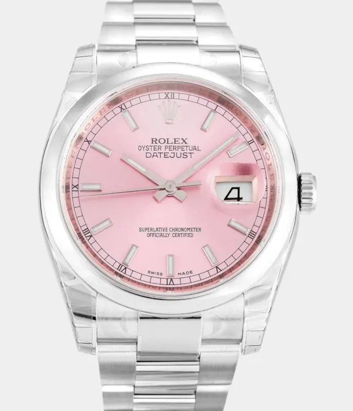 Die Rolex Datejust 116200 mit rosafarbenem Zifferblatt vereint feminine Eleganz mit klassischem Design. Mit glatter Lünette, Edelstahlgehäuse und automatischem Uhrwerk ist sie ein stilvolles Statement für jeden Tag.