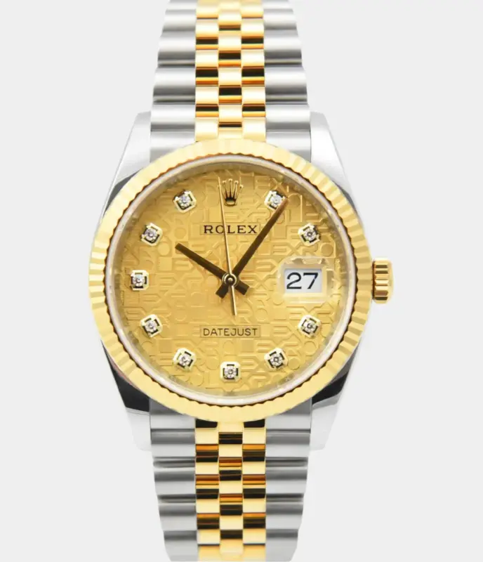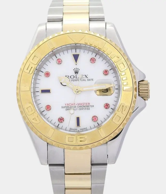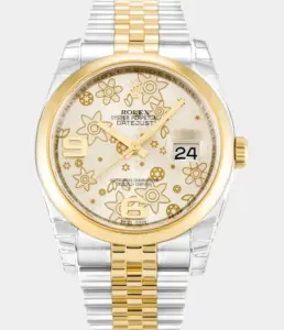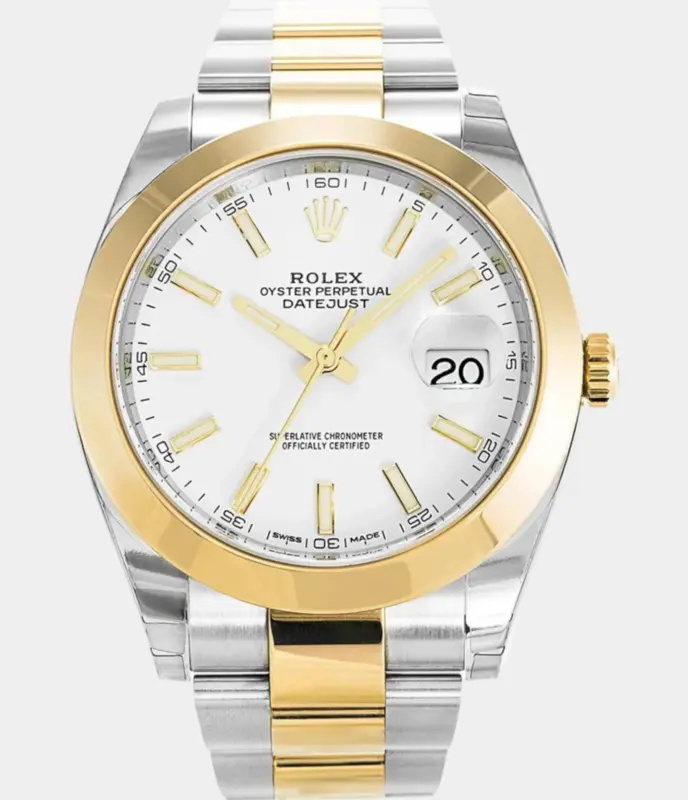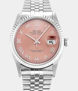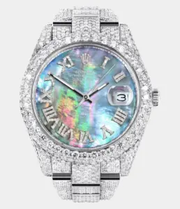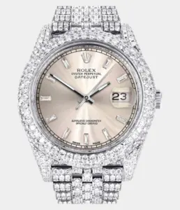 Diese luxuriöse Rolex Datejust 41 Replik ist vollständig mit 25 Karat Diamanten besetzt und verfügt über ein Dawn Pink Diamond-Zifferblatt, zweifarbigen Look und ein massives Oyster-Band – ein kraftvolles Statement aus Eleganz und Exklusivität.