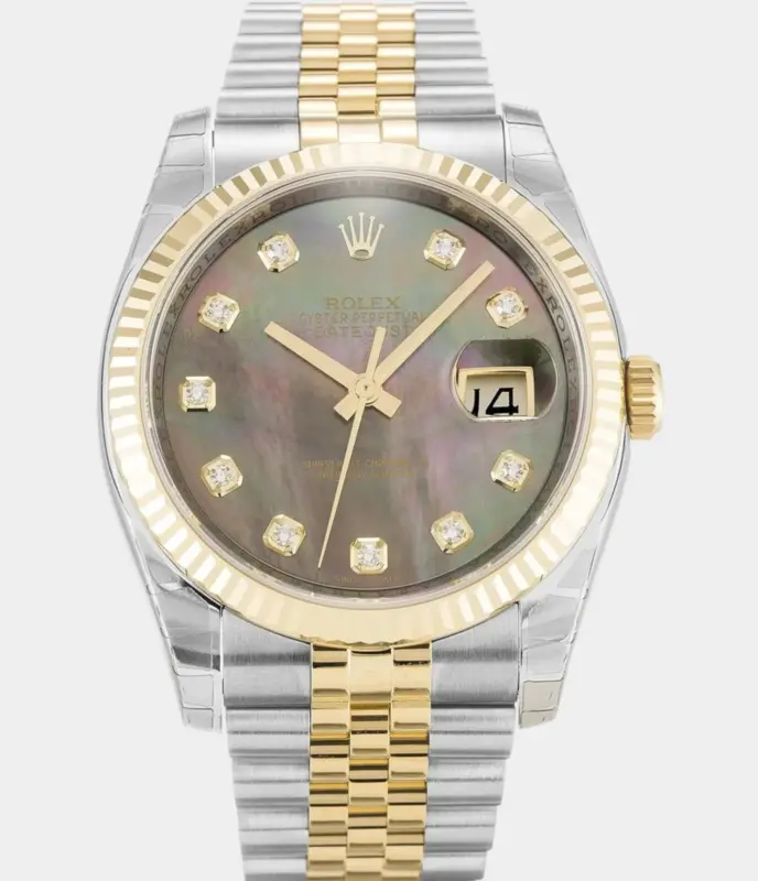 Die Rolex Datejust 116233 Replik kombiniert ein schwarzes Zifferblatt mit zweifarbiger Ausführung aus Edelstahl und Gelbgold. Klassisch, luxuriös und absolut zeitlos – ideal für elegante Anlässe oder den stilvollen Alltag.