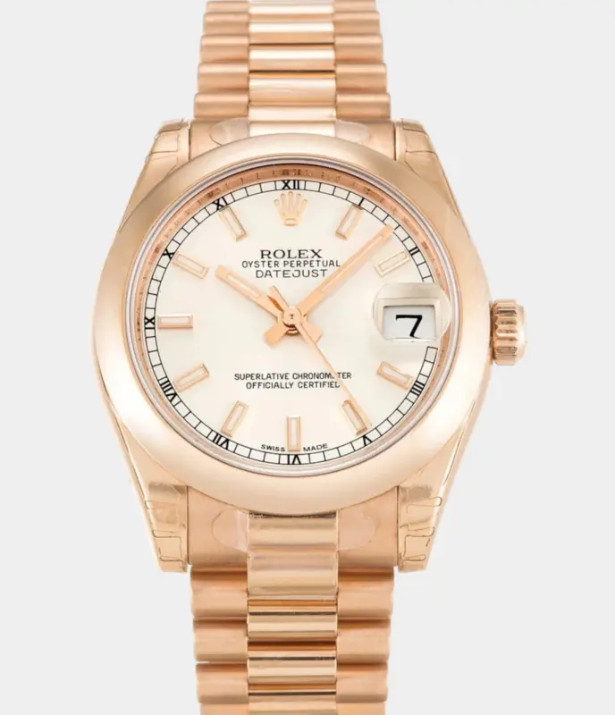 Die Rolex Datejust 178245 Replik aus massivem Everose-Gold mit silbernem Zifferblatt verbindet luxuriöse Materialien mit klassischer Eleganz. Ideal für Damen, die auf zeitlose Schönheit und höchste Handwerkskunst setzen.