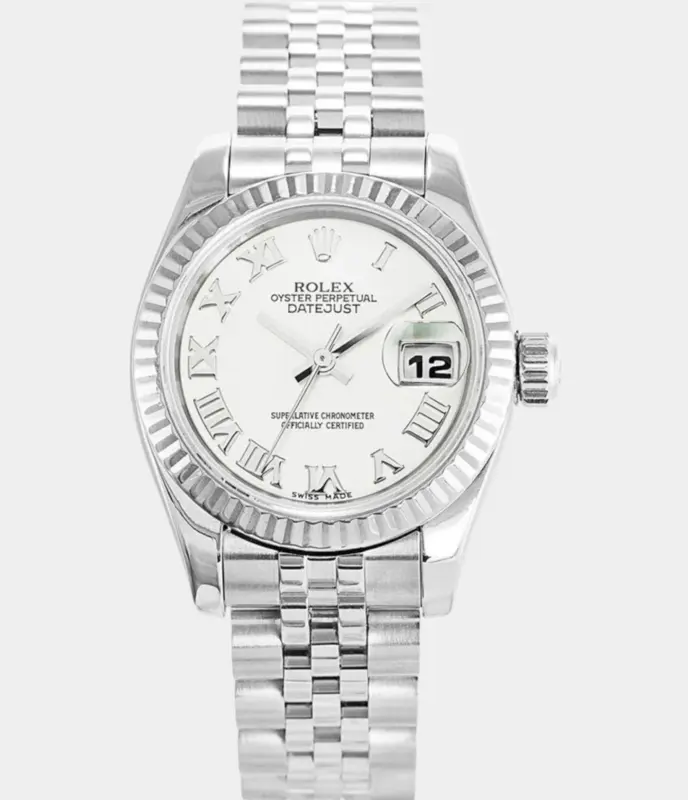 Die Rolex Datejust 179174 Replik mit weißem Zifferblatt, 26 mm Gehäuse und geriffelter Weißgold-Lünette vereint klassische Eleganz mit höchster Uhrmacherkunst – perfekt für Damen, die Wert auf Stil und Präzision legen.