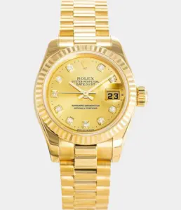 Die Audemars Piguet Royal Oak Vintage Damen-Replik aus Gelbgold mit Champagner-Zifferblatt und Diamantindexen verbindet Haute Horlogerie mit femininer Eleganz – ein luxuriöser Klassiker mit Quarzwerk für stilbewusste Trägerinnen.