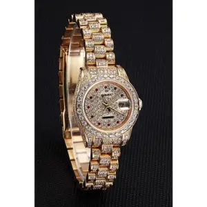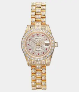 Diese luxuriöse Rolex Datejust 41 Replik für Damen ist mit 25 Karat Diamanten besetzt und besitzt ein individuell gestaltetes arabisches Diamantzifferblatt. Ein opulentes Design mit zweireihigem Oyster-Band – maximaler Glanz trifft auf meisterhafte Verarbeitung.