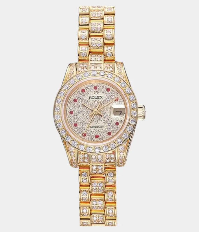 Diese Rolex Datejust 41 Replik ist komplett mit Diamanten besetzt – über 25 Karat – und verfügt über ein individuelles Perlmutt-Zifferblatt mit arabischen Ziffern aus Diamantbesatz. Eine luxuriöse Zweiton-Uhr mit Oyster-Band für höchste Ansprüche.
