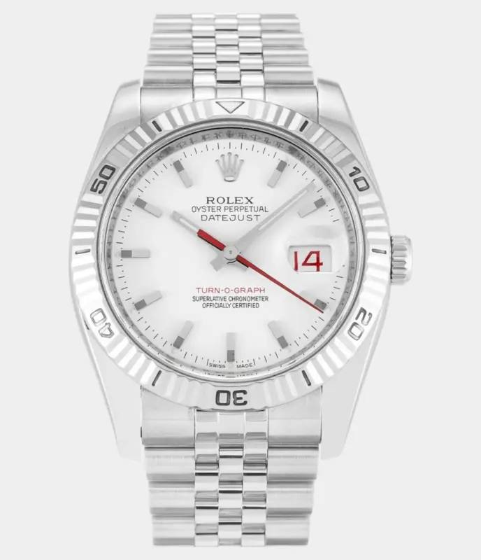 Die Rolex Datejust Turn-O-Graph 116264 Replik vereint klassisches Design mit sportlicher Funktionalität. Mit weißem Zifferblatt, rotierbarer Lünette und 36 mm Edelstahlgehäuse mit Weißgold – ideal für Liebhaber ikonischer Datejust-Modelle mit sportlicher Note.