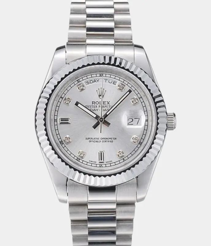 Die Rolex Day-Date 41995 Replik mit silbernem Zifferblatt und klassischem President-Armband verkörpert zeitlose Eleganz in ihrer reinsten Form – ein stilvoller Begleiter für jeden Anlass.