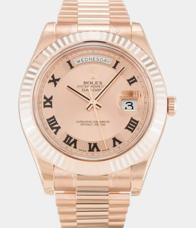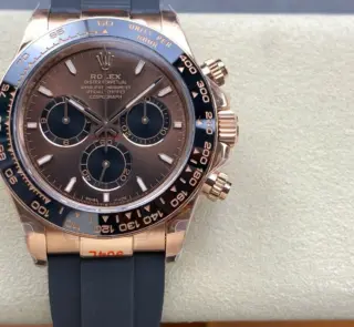Diese luxuriöse Rolex Datejust 41 Replik mit 25 Karat Diamanten, zweifarbiger Ausführung und braunem römischen Zifferblatt ist ein wahres Meisterwerk – kombiniert Glamour mit klassischer Rolex-Eleganz auf höchstem Niveau.