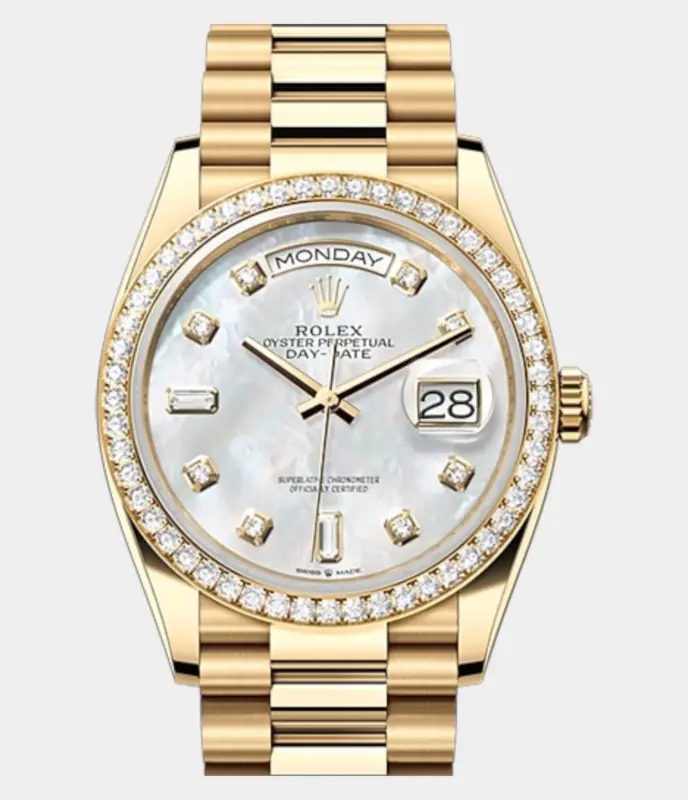 Die Rolex Day-Date 621614 Replik mit Diamantzifferblatt, 36-mm-Gehäuse und President-Armband verkörpert höchste Eleganz und zeitlose Raffinesse – ein stilvoller Ausdruck von Luxus.