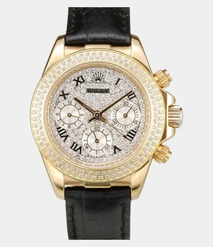 Die Rolex Daytona 98238 Replik mit 35 mm Gehäuse und diamantbesetztem Zifferblatt verbindet sportliche Chronographenoptik mit luxuriöser Ausstrahlung – ein edler Blickfang für stilbewusste Träger.