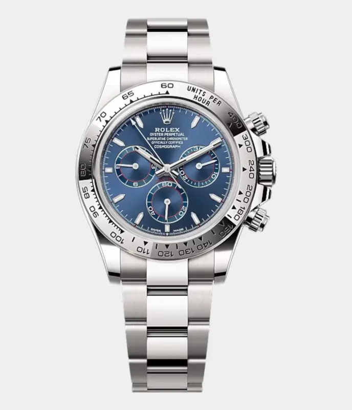 Die Rolex Daytona 126509 Replik mit strahlend blauem Zifferblatt vereint sportliche Chronographenfunktion mit luxuriösem 40 mm Gehäuse und markanter Tachymeter-Lünette – ein Meisterwerk für stilbewusste Motorsportfans.