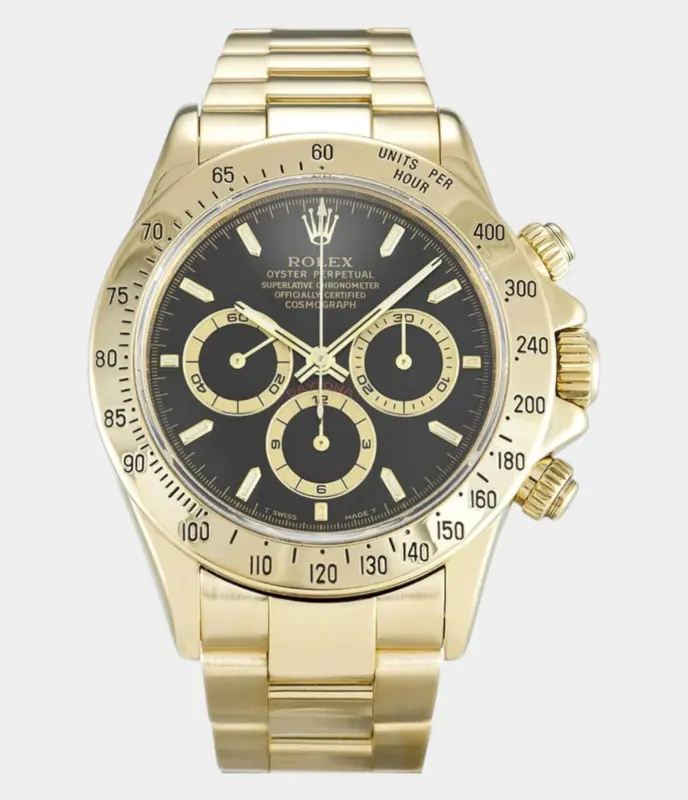 Die Rolex Daytona 116528 mit 40 mm Durchmesser und schwarzem Zifferblatt kombiniert sportliche Eleganz mit luxuriösem Design. Mit einem robusten Automatikwerk, einer drehbaren Lünette aus 18 Karat Gelbgold und außergewöhnlicher Wasserdichtigkeit ist diese Uhr ideal für Uhrenliebhaber, die Leistung und Luxus suchen.