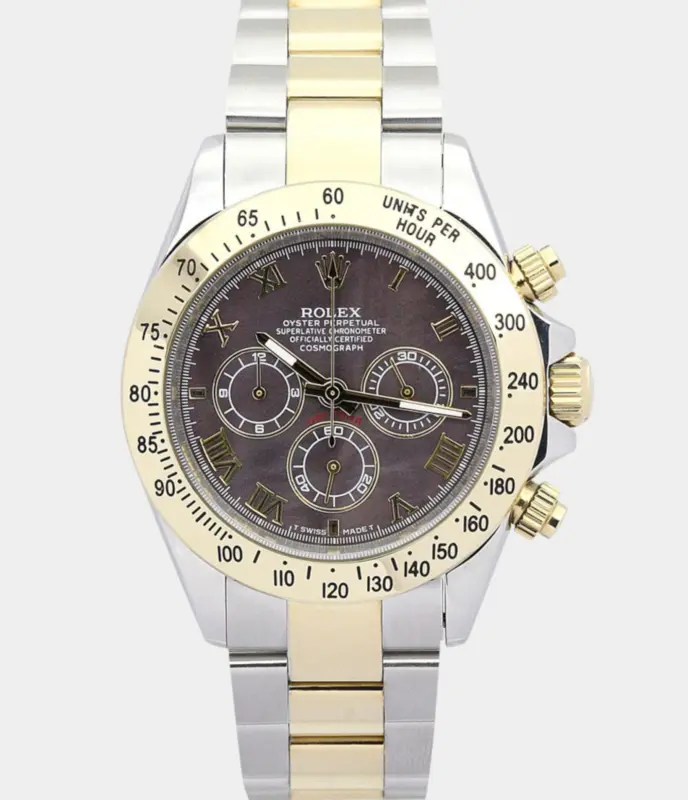 Die Rolex Daytona 116523 mit dunkelbraunem Zifferblatt und zweifarbiger Ausführung verbindet sportliche Chronographenfunktion mit edlem Luxusdesign. Ein ikonischer Zeitmesser mit 40 mm Gehäuse und perfektem Swiss Mechanism Replikwerk.