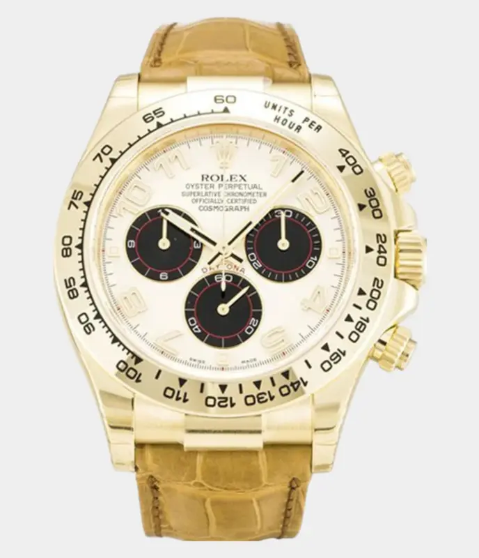 Die Rolex Daytona 116518 Replik mit weißem Zifferblatt, 40 mm Gelbgoldgehäuse und sportlichem Oysterflex-Armband kombiniert luxuriöse Ästhetik mit Rennsportfunktion – ein stilvoller Chronograph für höchste Ansprüche.