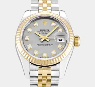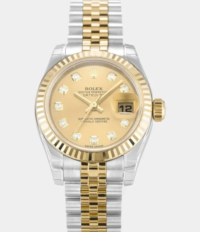 Die Rolex Lady-Datejust 179173 Replik vereint femininen Luxus mit klassischer Rolex-Präzision. Mit champagnerfarbenem Zifferblatt, geriffelter Gelbgoldlünette und zweifarbigem Jubilee-Band ist sie ein stilvoller Begleiter für jeden Anlass.