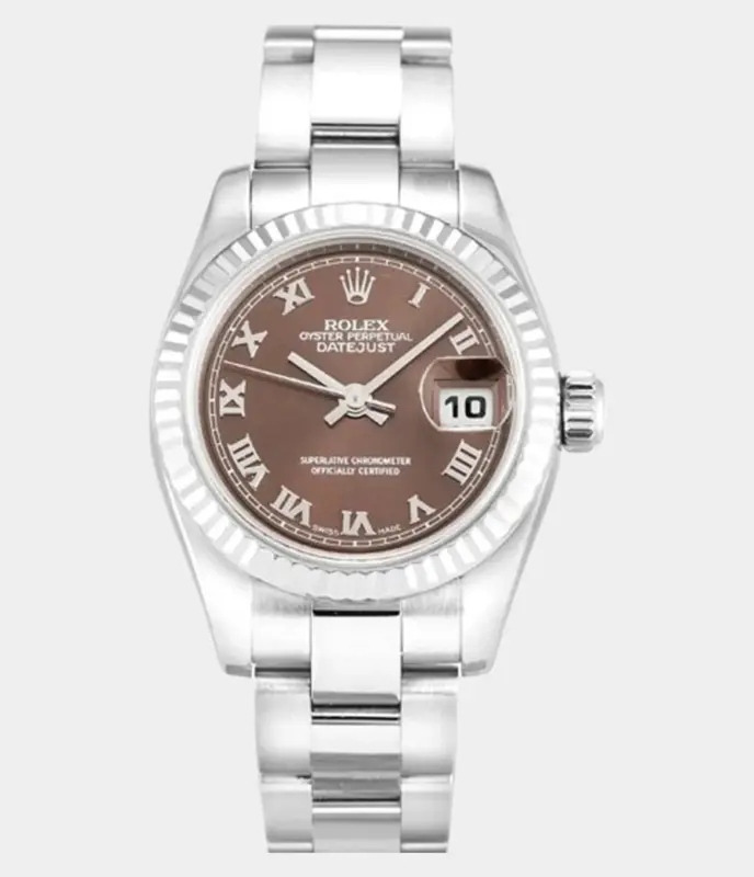 Die Rolex Lady-Datejust 179179 mit 26 mm Gehäusegröße, bronzefarbenem Zifferblatt und President-Armband aus Weißgold-Replik verkörpert dezente Eleganz und klassische Rolex-DNA – perfekt für stilbewusste Damen.