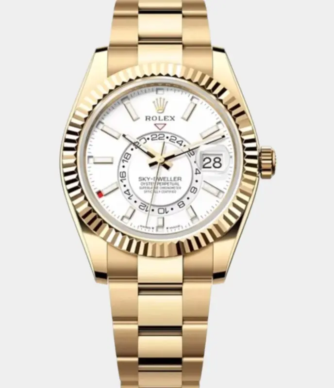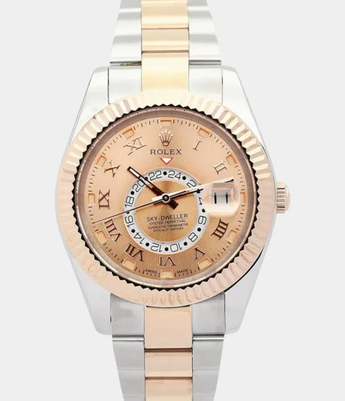 Die Rolex Sky-Dweller 326938-2 Replik mit champagnerfarbenem Zifferblatt ist ein Symbol für Prestige und technische Raffinesse – die perfekte Luxusuhr für Weltreisende mit Stil.