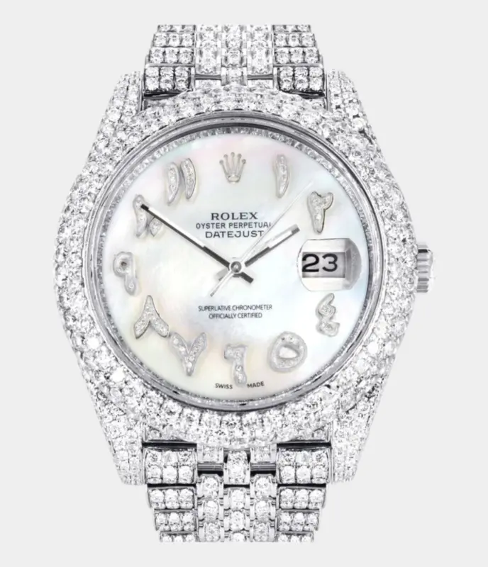 Diamond Iced Out Rolex Datejust 41 | 25 Carats Of Diamonds | Custom Mother of Pearl Arabic Numeral Diamond Dial | Two Row | Jubilee Band Replik