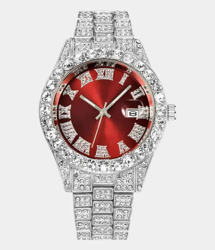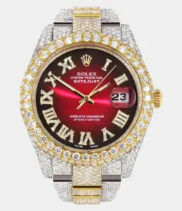 500,00 $ – 1.600,00 $Diamond Iced Out Rolex Datejust 41 | 25 Carats Of Diamonds | Red Black Roman Numeral Dial | Two Tone | Two Row | Oyster Band Replik