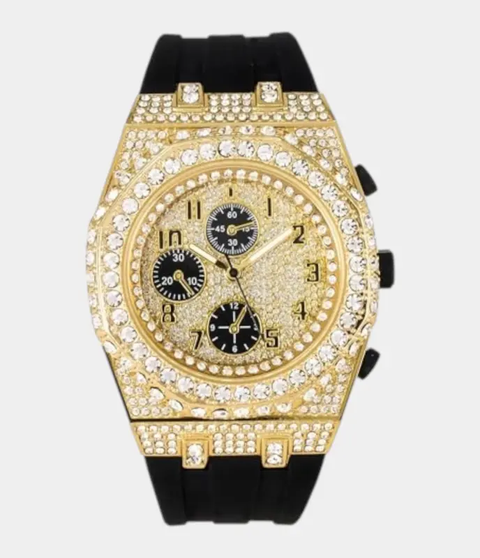 Men’s 43mm Iced-Out Watch – Octagonal Case with Black Silicone Band Replik