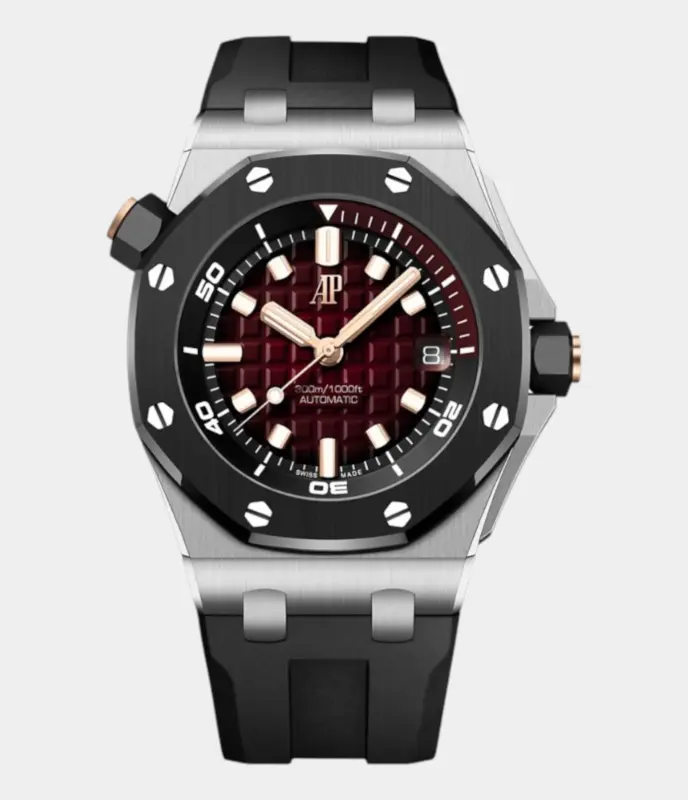 Die Audemars Piguet Royal Oak Offshore Diver Replik mit smoked rotem Zifferblatt und White-Gold-Finish ist eine markante Taucheruhr mit ikonischem Design. Ein luxuriöser, sportlicher Zeitmesser mit hoher Funktionalität und auffälliger Farbgebung.