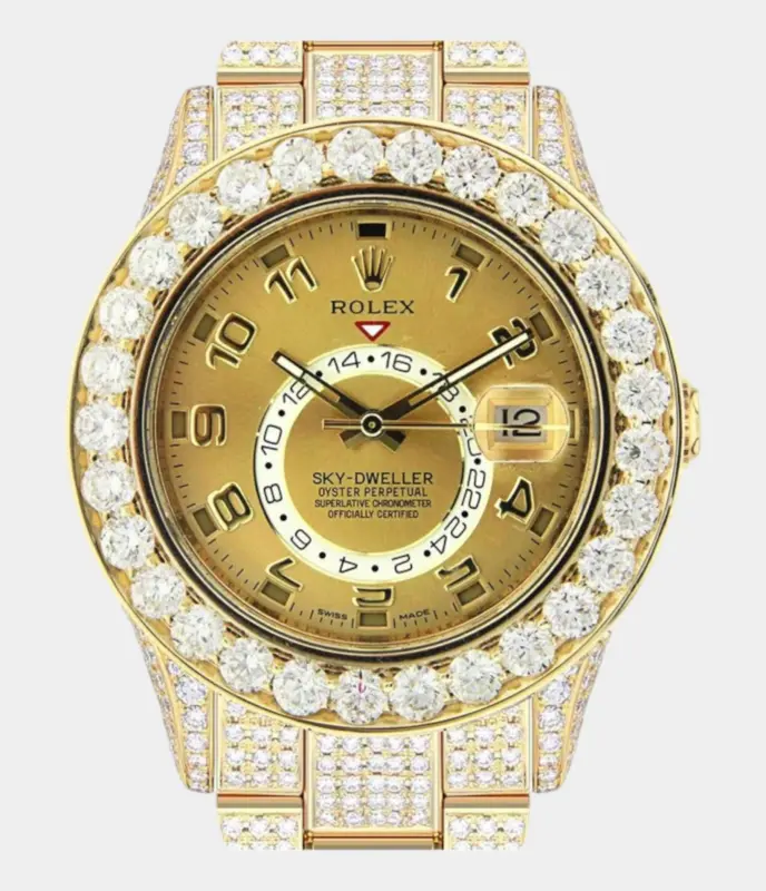 500,00 $ – 1.600,00 $Men’s Iced-Out Diamond Watch – Gold Red with Crystal Rhinestone Roman Numerals and Date Display Replik
